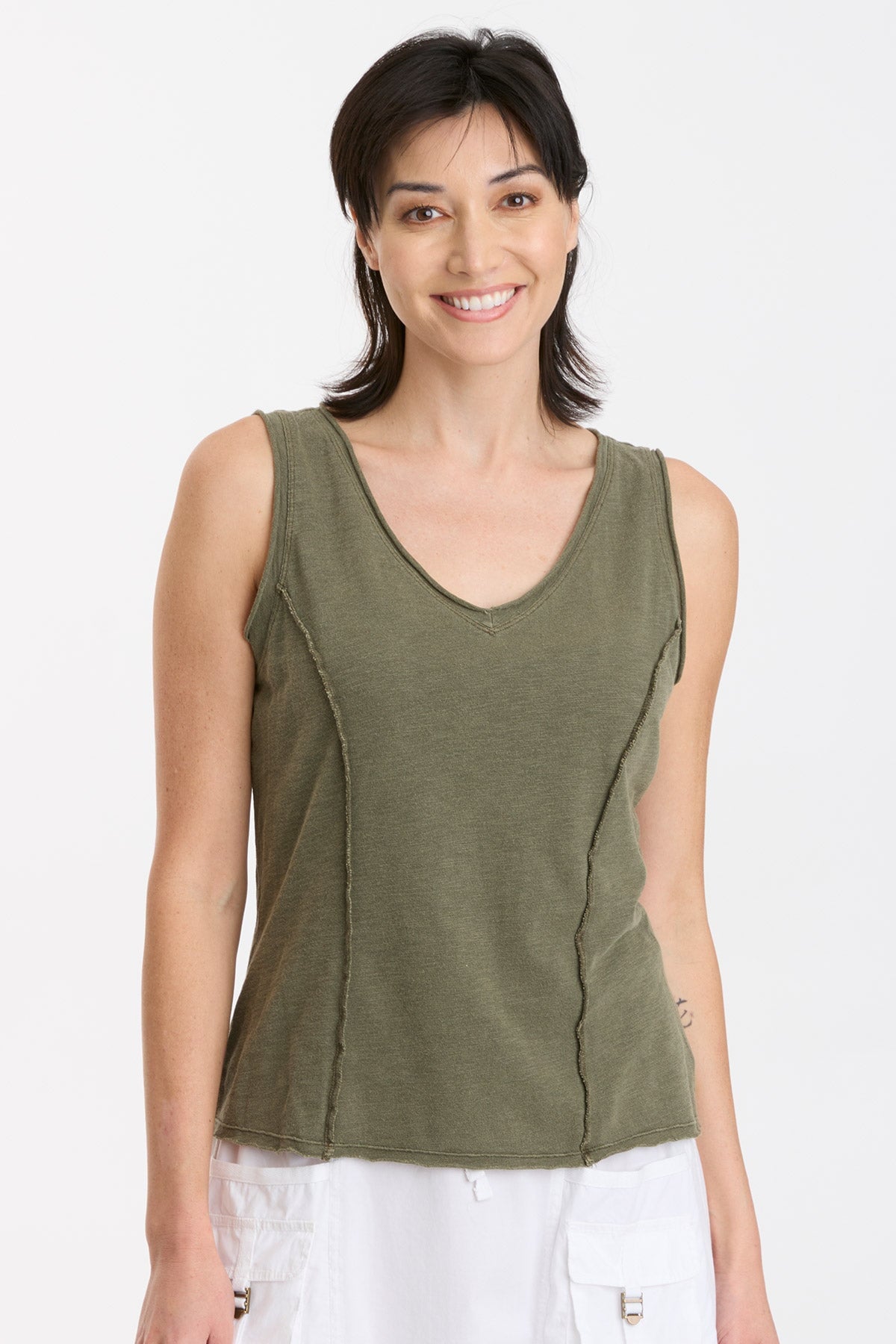 In slub jersey, the bra-friendly Laramie Tank features reversed stitched princess seams, a v-neck cut, and raw-edge details at the neck, hem, and armhole.