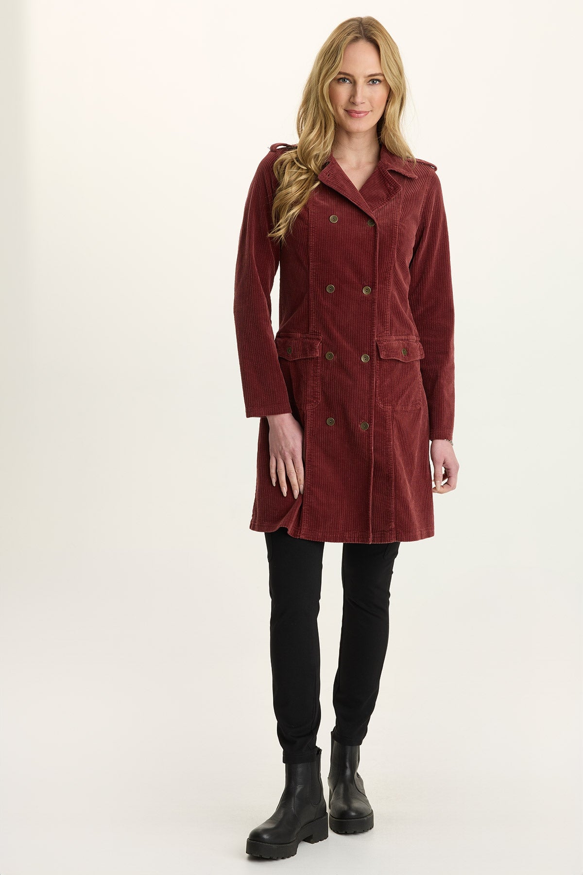 Elegant and versatile, this mid-length trench jacket stuns in corduroy. A split collar and classic double breasted button design make this style pop, along with envelope pockets on either hip.