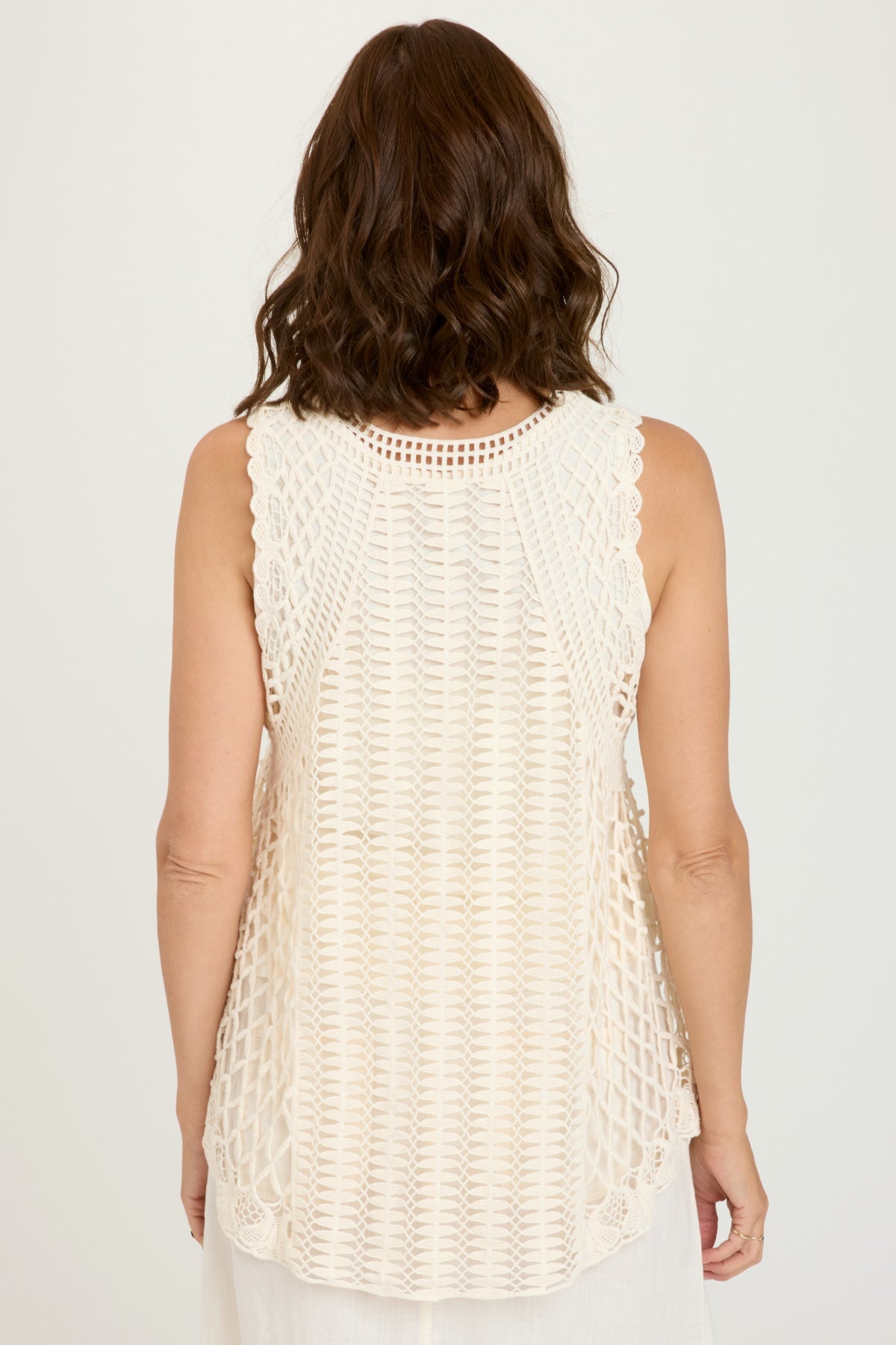 A v-neck cut and asymmetrical hem bring out the best in this layered crochet tank. Delicate and beautiful, Rue absolutely rules!